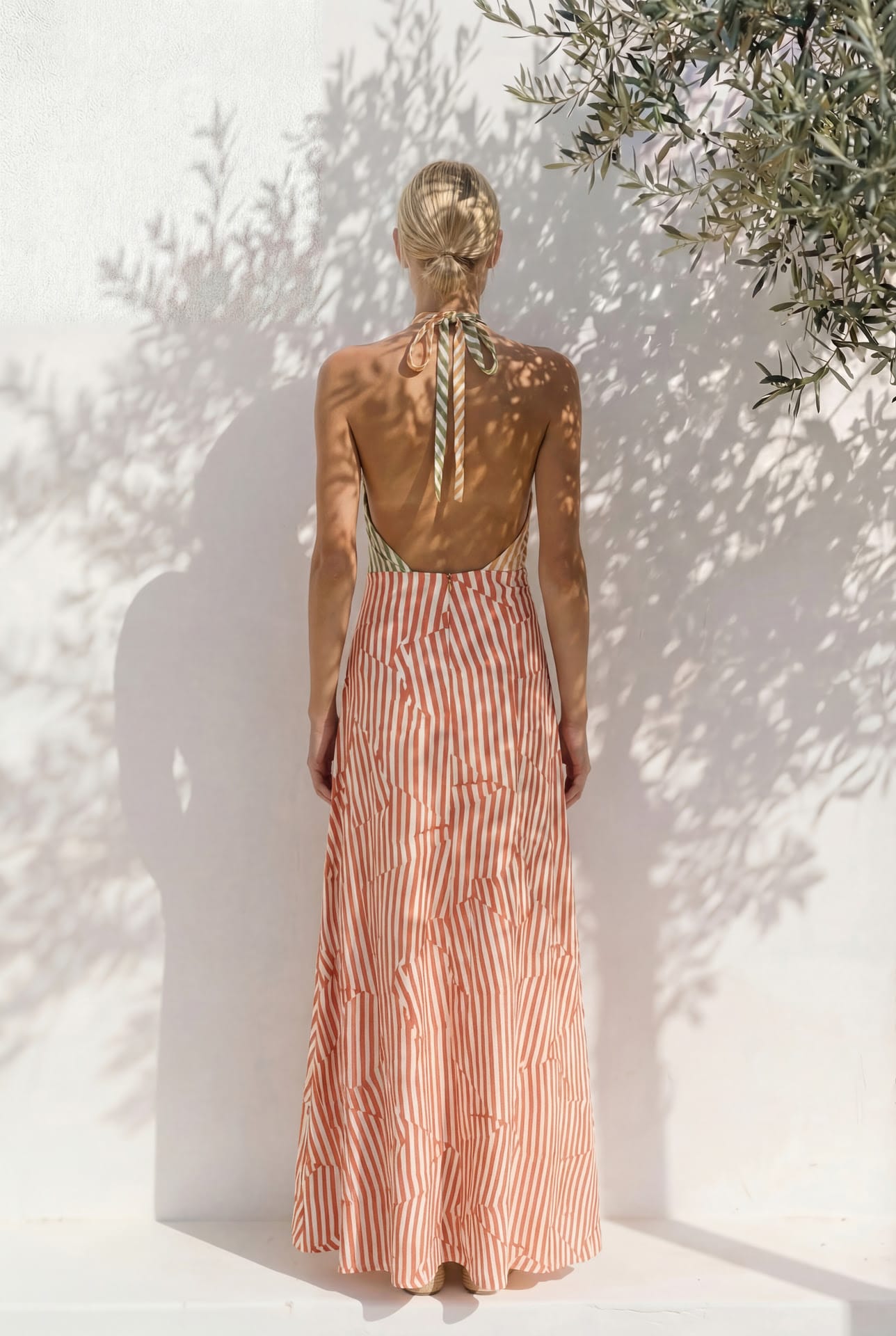 neckline tied at the neck and a fully open back, defining a sophisticated and feminine silhouette.