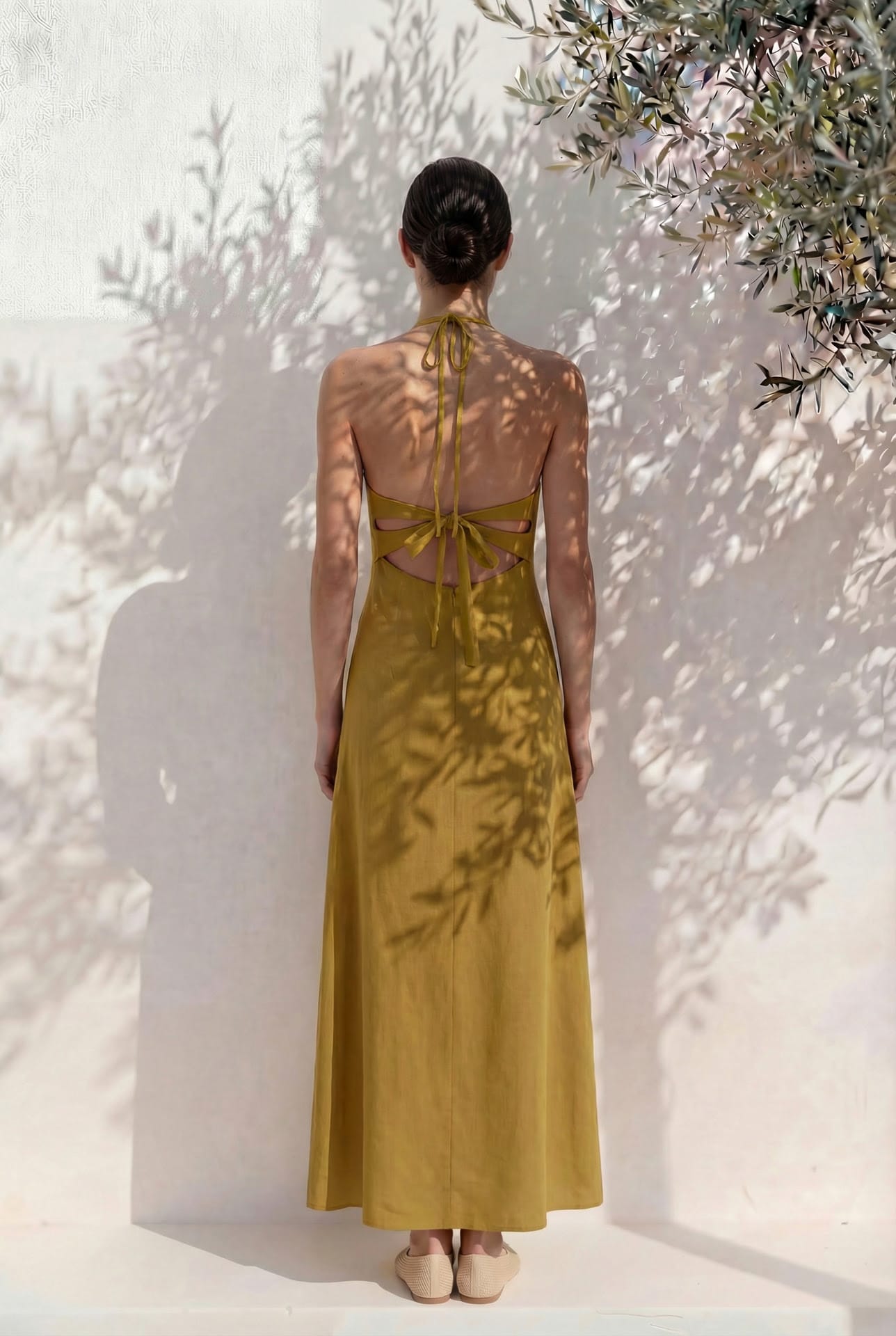 El diseño destaca por su escote halter fruncido, con tres aberturas tipo lágrima en el delantero, que aportan un aire delicado al conjunto. La espalda abierta, con una pieza central tipo mariposa, convierte el vestido en una pieza especial y singular. La silueta se ajusta suavemente en la cintura y la falda cuenta con una abertura lateral que añade movimiento y ligereza. Lleva forro interior para un acabado cuidado.