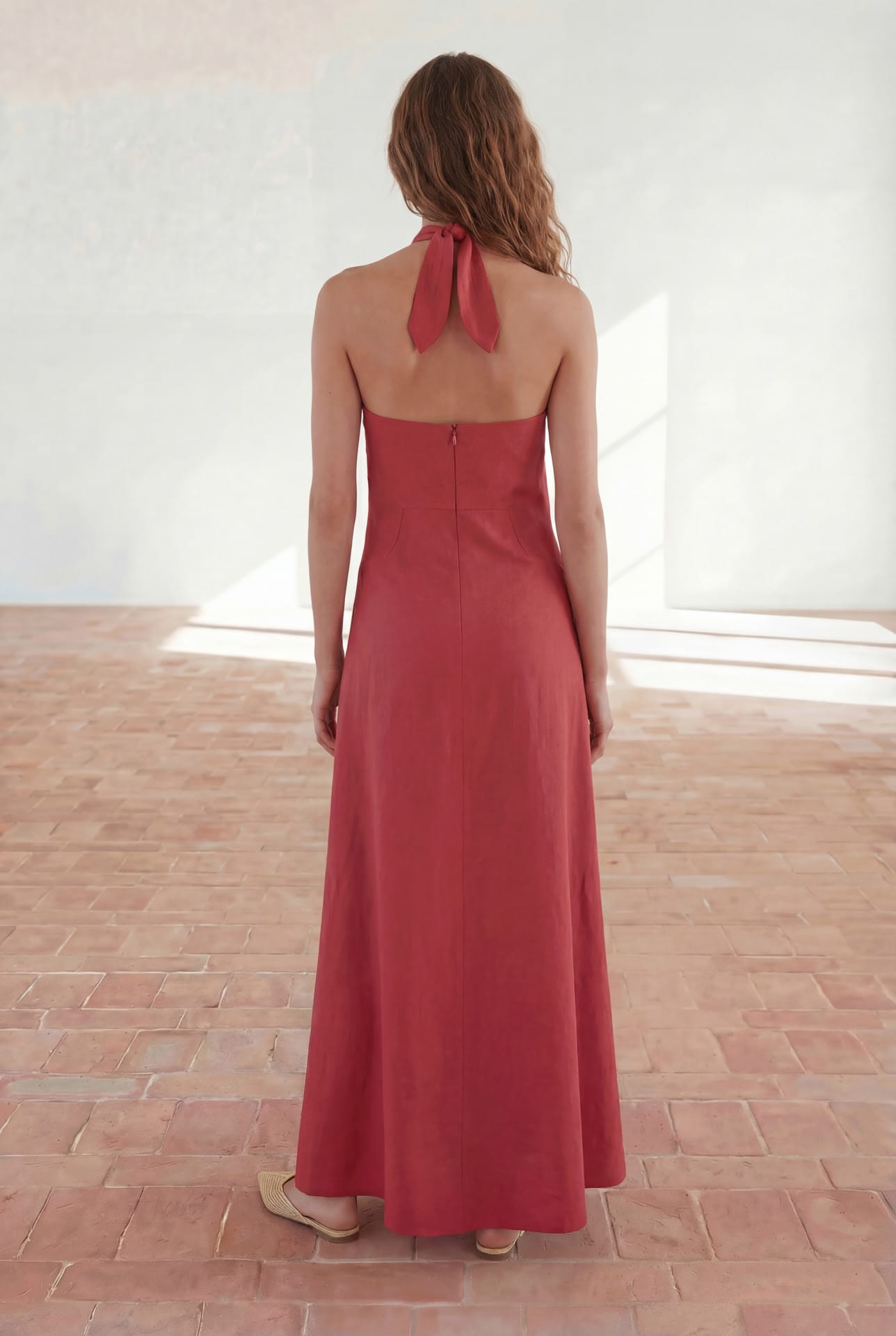 El diseño se define por un escote halter con nudo central, realizado en otro tejido de color a contraste, que aporta un punto distintivo al conjunto. El vestido presenta un juego de líneas de confección en el cuerpo y la espalda, que estilizan la silueta. La falda de corte campana, con godets, añade amplitud y movimiento. Cuenta con forro interior para un acabado cuidado.